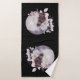Handtuchhandtuch mit Aquarellmalerei einer schwarzen Katze und einem lila und rosa Blumenstrauß. Stehend vor einem großen Vollmond. Stilvoll und magisch.