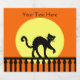 Dieses individuelle Bierflaschenlabel hat eine schwarze Katze mit einem gewölbten Rücken und grünen Augen, die auf einem schwarzen Zaun vor einem vollgelben Mond auf hellorangefarbenem Hintergrund stehend ist. Passen Sie Ihren Text mit der Vorlage an.