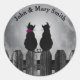 schwarze Katzen auf einem Holzzaun mit Schwänzen, die im Mondschein als Herz verbunden sind