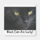 Eine schöne und geheimnisvolle schwarze Katzengesicht auf einem Magneten mit der Beschriftung Black Cats Are Lucky!