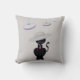 Kopfkissen mit niedlicher schwarzer Katze und fliegenden Untertassen nur auf der Vorderseite auf silberfarbenem Hintergrund.