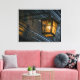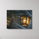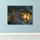 Ein nahes Foto einer schönen schwarzen Laterne, die nachts beleuchtet und auf einer Leinwand gedruckt wurde.