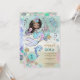 Kleine Mädchen Liebe magische Dinge. Diese zauberhafte Party Einladung unter der Meerjungfrau und dem Delfin zum 1. Geburtstag wird die Gäste mit einem skurrilen Flair, mit Meerjungfrau, Delphin, Schildkröte und Muscheln, in hübschen Farbtönen von Rosa, Blau und lila. Mermaid Schwanz skaliert auf der Rückseite der Einladung. Eine Welt der Magie und des Geheimnisses unter Wasser.