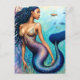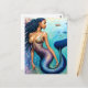 Auf dieser Postkarte befindet sich ein braungehäuftes Meerjungfrau mit lila und blauen Haaren und einem Schwanz mit Fischen, Meeresalgen und Korallen. Ihre Augen sind geschlossen, während sie fiebrigen Fisch serviert! Ocean-Core Ästhetik mit einem hübschen schwarzen Mädchen.