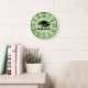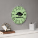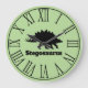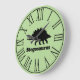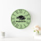 Schwarze moderne Stegosaurus-Silhouetteuhr mit einem grünen Hintergrund und großen schwarzen römischen Ziffern.