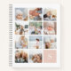Passen Sie dieses Wendelheft mit elf quadratischen Fotos an, die in einem Rasterkollage-Layout angeordnet sind, wobei Ihr Single eine erste Monogramm auf einem rot rosa Quadrat unten rechts hat. Die Rückseite hat Ton auf den farbenfrohen rosa Streifen.