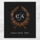 Personalisieren und fügen Sie Ihre Monogramm-Initialen und das Hochzeitdatum. Die Einrichtung ist mit einem goldfarbenen Kranz in klassischer Rose dekoriert. Schwarzer Hintergrund.