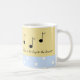 Ein zarter gelber Hintergrund mit einem Rand aus blau-weißen Polka Punkten. Schwarze Noten, die oben mit einem musikalischen Sprichwort schwimmen. "Lass die Musik, die du bewegst" Musikliebhaber werden diese kreative Tasse genießen.