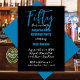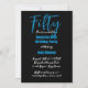 Meilenstein Geburtstagsfeier Einladung für einen Mann. Schwarze Einladungen mit weißen und echten blauen Farben. Schriftart sind Drehbücher und moderne Drucke fett für den Titel und Namen von Party und Ehrenzeichen.