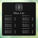 Present your services with style mithilfe dieses schwarzen Preislisten-Fenster decal. Ideal für Salons, Cafés, Einzelhandelsgeschäfte und Büros, kann diese individuelle Schaufenstersignatur mit Ihrem Firmenlogo und Ihren Details personalisiert werden. Das minimalistische, moderne Design macht es einfach zu lesen, während das langlebige Material eine lange Lebensdauer garantiert. Eine schlanke Möglichkeit, Preise anzuzeigen und gleichzeitig Ihre Marke zu fördern.
