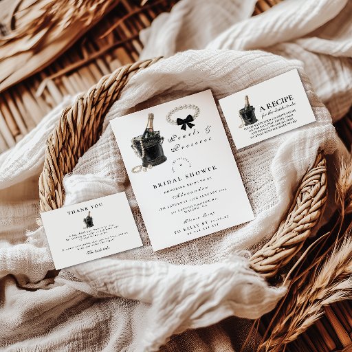 Ein modernes und luxuriöses Design für einen Junggesellinnenabschied mit einer schicken schwarzen Satinschleife, funkelnden Perlen und einer klassischen Champagnerglas-Illustration. Das knackig weiße Layout hält die Ästhetik raffiniert, während die fetten schwarzen Akzente einen Hauch von Glamour hinzufügen – perfekt für eine „Perlen & Prosecco“-Themenevent. Dieses Design gibt den Ton für ein hochklassiges, femininines und unvergessliches Ereignis an, das Ihre Gäste lieben werden.