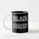 Schwarze Schaf-Kaffee-Tasse. Wörter "schwarze Schafe" auf anderer Seite der Tasse.