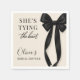 Partytücher mit einem klassischen schwarzen Schleifenmotiv und dem Satz sie knüpft den Knoten. Entworfen für eine saubere, elegante Tischdekoration, die gut zu schwarzer und weißer Hochzeitsdeko passt. Geeignet für Brautduschen, Verlobungsfeiern, Junggesellinnenabschiede und Hochzeitsfeiern. Vollständig anpassbarer Text mit einem druckfertigen Design für Cocktail- oder Lunch-Tücher.