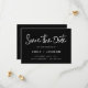 Schwarzes modernes und elegantes Minimalistisches Handschrift Schrift Save the Date Hochzeitspostkarte. Die Save the Date einladende Einladungskarte beinhaltet eine moderne, handgeschriebene Schrifttypografie mit einem schicken und schlichten Design, mit dem Sie Ihre individuelle Verlobung-Fotografie hinzufügen können.