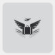 Eine kühn schwarze Silhouette-Design eines Koffers mit einem Flugzeug hoch oben, Flügel scharf geknickt, reduziert auf saubere geometrische Formen für ein Reise-inspiriert Emblem, Set gegen Weiß.