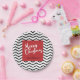 Dieser Pappteller kennzeichnet ein modernes Zickzackmuster im Schwarzen auf einem weißen Hintergrund. Ein rotes Quadrat in der Mitte der Platte wird mit einem Hand beschrifteten Schriftart, im Weiß betont, das liest: Frohe Weihnachten. Auch im Kasten ist kundengerechter schwarzer Text für Ihren Namen und Jahr.