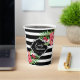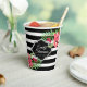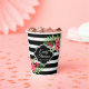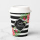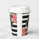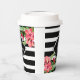 Schwarz-Weiß geometrische Streifen und rosa exotische Blume. Anpassbare Papierbechervorlage
