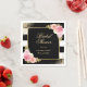 Elegante Blumenservietten aus Aquarellpapier mit rot-rosa Blume und vergoldetem Grün auf schwarz-weiß gestreiften Hintergrund. Matching-Elemente verfügbar.