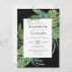 Dieses Design zeichnet sich durch tropisches, wasserfarbenes Blattwerk aus, das üppige, grüne Monstera und Blätter aus Palmen umgibt, die einen rechteckigen, weißen Rahmen auf schwarzem Hintergrund umgeben. Personalisieren Sie es mit den Namen der Braut und Bräutigam und Hochzeitsdetails. Die Rückseite ist schwarz.