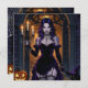 Einladungen zum Halloween-Party mit einer wunderschönen Hexe in Schwarz und lila mit einem Kandelabra, einer schwarzen Katze, einer Kürbislaterne, die vor der Tür eines Spuk Herrenhauses stehend ist und die Gäste einlädt.