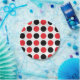 Abstrakte Kunst aus schwarzen und roten Polka-Punkten auf weißem Hintergrund.