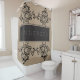 Verzierte, schwarz gescrollte Blätter, die oben und unten mit einem schwarzen Rechteck mit dekorativen Monogramm versehen sind. Personalisierter Text ist weiß und in einem Schriftart im Dot-Stil. Großer Glam Rock Stil Duschvorhang.