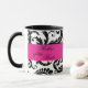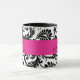 Diese Chicschwarzweiss-Damast-Tasse mit einem Band des heißen Rosas bringt die Hochzeitseinladung zusammen, die unten gezeigt wird und wird für die Mutter der Braut besonders angefertigt. Sie würde ein nettes Andenken für Ihre Mama machen. Der Text ist kundengerecht und Sie können von einer Vielzahl der Tassenarten und -größen wählen.