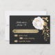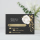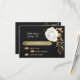 Schöne, individuell anpassbare botanische Rsvp-Karte schöne weiße Blume mit goldenen Blätter vor elegantem schwarzem Hintergrund