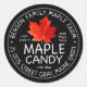 Bearbeiten Sie Ihren Firmennamen, Ihre Adresse, das Nettogewicht der Ahornbonbons und Ihre Sorte. Realistisches rote Ahornblatt mit morphologischen Details auf schwarzem Hintergrund. Weißer Text der Tafel. Einfache weiße Linie entlang der Grenze des Etiketts.