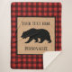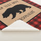 In der Mitte befindet sich eine Silhouette eines schwarzen Bären mit Vorlagen in schwarzer Schrift, sodass Sie das Bild und den Text in einem schwarzen Rahmen mit einem Rutschplatz personalisieren können. Das Hintergrundmuster ist ein kariertes schwarz-rotes Büffel.
