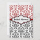Schwarz-weiße Hochzeit mit rotem Damast Brautdusche. Der obere Teil besteht aus rotem und weißem Damast-Muster und der untere Teil ist schwarz-weiß. Ein roter Streifen trennt die beiden Teile. Ihr Text wird auf einem eleganten Etikett mit weißer und roter Kontur geschrieben.