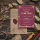 Die Einladung zeigt ein Vintag inspiriertes Design mit dunkelrosa Hintergrund und pfirsichorangefarbenem Text. Das Layout ist symmetrisch, mit einem zentralen Bild eines gruseligen Friedhofs, der durch verzierte Ränder gerahmt ist. Fledermäuse, Schädel und andere spukhafte Elemente sind im gesamten Design verstreut und ergänzen das Halloween-Thema. Die Ästhetik ist elegant und unheimlich und schafft ein Gefühl der Vorfreude für die Veranstaltung.