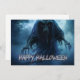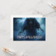 Ein düsterer, schwebender schwarzer Geist mit ätherischer Form, umgeben von dichten Nebelwolken, der bedrohlich über dem Boden in einer dunklen, hellischen Landschaft mit einer unheimlichen Atmosphäre schwebt. Happy Halloween
