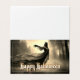 Ein düsterer, schwebender schwarzer Geist mit ätherischer Form, umgeben von dichten Nebelwolken, der bedrohlich über dem Boden in einer dunklen, hellischen Landschaft mit einer unheimlichen Atmosphäre schwebt. Happy Halloween