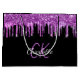 Ein eleganter schwarzer Hintergrund mit lila und rosa Imitaten Glitzer Tropfen, Maltropfen Aussehen. Personalisieren und fügen Sie Datum, Namen und Alter hinzu. Eine moderne Handschrift, lila Buchstaben. Ideal für Geschenkpackungen oder Gastgeschenke für Geburtstagspartys, Brautparty- und Babyduschen.