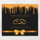 Imitate goldfarbene Schleife und Bogen mit Imitaten goldenen Glitzer Tropfen, Farbe Tropfen aussehen. Ein schicker schwarzer Hintergrund. Personalisieren und fügen Sie Ihre Monogramm, Initialen und ein Datum. Mit dem Text. Alles Gute zum Geburtstag. Goldene Buchstaben.