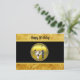 Schwarzer Gürtelkarate, der eine schwarze Trainingstasche kickt. Dieser Cartoon zeigt ihm, dass er aggressiv mit Beinschlag im Fitnessraum ist. Lass dieses unterhaltsame, humorvolle Kinderdesign redet für dich. Mit goldener Folie und schwarzer Textur hinten gemahlen.