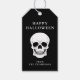 Ein Set mit weißem Schädel vor schwarzem Hintergrund mit zwei personalisierbaren Textbereichen. Das obere liest "Happy Halloween" und das untere lasse, einen Namen oder eine kurze Nachricht hinzuzufügen. Ideal, um Halloween-Geschenke, Gastgeschenke oder Leckerei-Taschen in einem schlichten, spukhaften Stil anzuziehen.