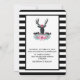 Eine Hochzeitseinladung mit einem schwarzen Hirschkopf mit großen Geweihten. Geometrische Linien im Hirschgesicht fügen eine kreative Touch hinzu. Eine farbenfrohe rosa Blume und minzgrüne Blätter bilden eine Krone auf seinem Kopf und ein Blumenstrauß auch Erholungen darunter. Eine Gebirgskizze inmitten der Blume trägt ebenfalls zum rustikalen Landgefühl bei. Hintergrund ist ein schwarz-weiß gestreiftes Muster.