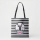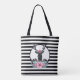 Ein Totbeutel personalisiert mit Monogramm-Initialen. Designed mit einem schwarzen Hirschkopf mit großen Geweih. Geometrische Linien im Hirschgesicht fügen eine kreative Touch hinzu. Eine farbenfrohe rosa Blume und minzgrüne Blätter bilden eine Krone auf seinem Kopf und ein Blumenstrauß Erholungen unter seinem Kopf. Eine Bergrangesketch inmitten der Blume trägt ebenfalls zum rustikalen Landgefühl bei. Hintergrund ist ein schwarz-weiß gestreiftes Muster.