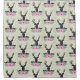 Ein Duschvorhang mit einem schwarzen Hirschkopf mit großen Geweih-Geweih. Geometrische Linien im Hirschgesicht fügen eine kreative Touch hinzu. Farbenfrohe rosa Blume und minzgrüne Blätter bilden einen hübschen Blumenstrauß unter seinem Kopf. Eine Gebirgskizze inmitten der Blume trägt ebenfalls zum rustikalen Landgefühl bei.
