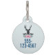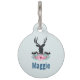 Ein Haustier-Tag personalisiert mit einem Namen und Telefonnummer (auf der Rückseite), mit einem schwarzen Hirschkopf mit großen Geweih-Anhängern. Geometrische Linien im Hirschgesicht fügen eine kreative Touch hinzu. Farbenfrohe rosa Blume und minzgrüne Blätter bilden einen hübschen Blumenstrauß unter seinem Kopf. Eine Gebirgskizze inmitten der Blume trägt ebenfalls zum rustikalen Landgefühl bei.