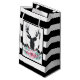 Eine Geschenktafel mit einem schwarzen Hirschkopf mit großen Geweihten. Geometrische Linien im Hirschgesicht fügen eine kreative Touch hinzu. Farbenfrohe rosa Blume und minzgrüne Blätter bilden einen hübschen Blumenstrauß unter seinem Kopf. Eine Gebirgskizze inmitten der Blume trägt ebenfalls zum rustikalen Landgefühl bei. Hintergrund ist ein schwarz-weiß gestreiftes Muster.