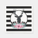 Papierservietten mit einem schwarzen Hirschkopf mit großen Geweih-Geweih-ern. Geometrische Linien im Hirschgesicht fügen eine kreative Touch hinzu. Farbenfrohe rosa Blume und minzgrüne Blätter bilden einen hübschen Blumenstrauß unter seinem Kopf. Eine Gebirgskizze inmitten der Blume trägt ebenfalls zum rustikalen Landgefühl bei. Hintergrund ist ein schwarz-weiß gestreiftes Muster.