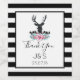 Eine Hochzeit danke Flaschenetikett. Vielen Dank, dass Sie in einem trendigen Kalligraphie-Schriftart geschrieben haben. Personalisiert mit den Initialen der Braut & Bräutigam und dem Hochzeitstag. Designed mit einem schwarzen Hirschkopf mit großen Geweih. Geometrische Linien im Hirschgesicht fügen eine kreative Touch hinzu. Farbenfrohe rosa Blume und minzgrüne Blätter bilden einen hübschen Blumenstrauß unter seinem Kopf. Eine Gebirgskizze inmitten der Blume trägt ebenfalls zum rustikalen Landgefühl bei. Hintergrund ist ein schwarz-weiß gestreiftes Muster.