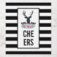 Ein CHEERS-Flaschenetikett. Vielen Dank, dass Sie in einem trendigen Kalligraphie-Schriftart geschrieben haben. Personalisiert mit den Initialen der Braut & Bräutigam und dem Hochzeitstag. Designed mit einem schwarzen Hirschkopf mit großen Geweih. Geometrische Linien im Hirschgesicht fügen eine kreative Touch hinzu. Farbenfrohe rosa Blume und minzgrüne Blätter bilden einen hübschen Blumenstrauß unter seinem Kopf. Eine Gebirgskizze inmitten der Blume trägt ebenfalls zum rustikalen Landgefühl bei. Hintergrund ist ein schwarz-weiß gestreiftes Muster.