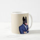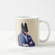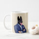 Humtierserie: Schwarzer Deutscher Hirte in einem Anzug in einer Zwei-Bild-Kaffee-Tasse. Ändern Sie die Hintergrundfarbe der Tasse, ändern Sie die Bildgröße und fügen Sie Ihren eigenen Text hinzu.