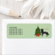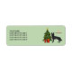 Desteis originelle Cartoon-Illustration eines bezaubernden, schwarzen Hundes der deutschen Schäferhunde. Der Hund wird von einem festlichen Weihnachtsbaum stehend, der mit roten und gelben Ornamenten verziert ist, einer Perlgarage und einem gelben Stern, der auf dem Baumgipfel steht. Es gibt auch zwei Geschenke vom Baum umwickelt und hinter dem Hund gibt es ein braunes Regal mit zwei Kerzen. Die Hintergrundfarbe ist hellgrün. Neben dem Design befindet sich ein personalisierbarer Textbereich.
