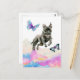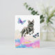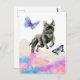 Schwarzer Hund springt über Regenbogenwolken Postkarte