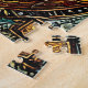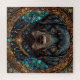 Hoch detailliertes und stilisiertes Portrait eines schwarzen Labrador Hundes. Der Ausdruck des Hundes ist verblüffend, mit tiefen, seelenvollen Augen, die Intelligenz und Wärme vermitteln. Die Umgebung des Hundes ist eine komplexe, dekorative Grenze, die Elemente wie Edelsteine und verzierte Muster kombiniert und so eine mystische und königliche Atmosphäre schafft. Die Verwendung von Farben, insbesondere Blues und Gold, verstärkt den künstlerischen Flair und verleiht dem gesamten Bild eine fantasieähnliche Qualität. Das Halsband des Hundes wirkt verziert, was die Eleganz des Stückes noch verstärkt.